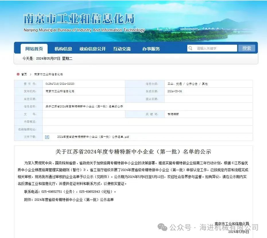 • 海進(jìn)機械榮獲“2024年度省級專精特新中小企業(yè)”認(rèn)證